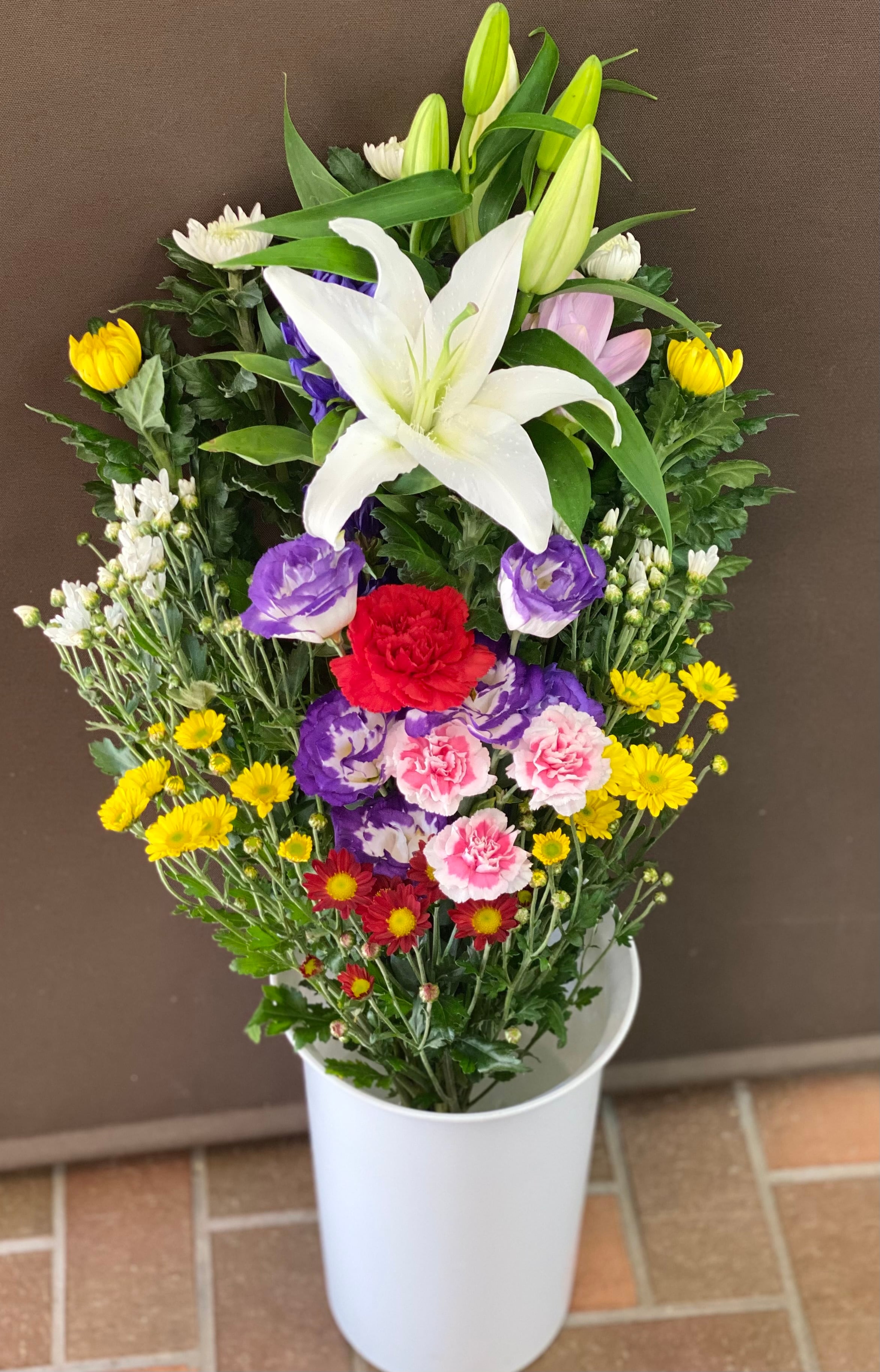百合、菊、カーネーション、季節の花などを入れて、見栄え良く仕上げました。