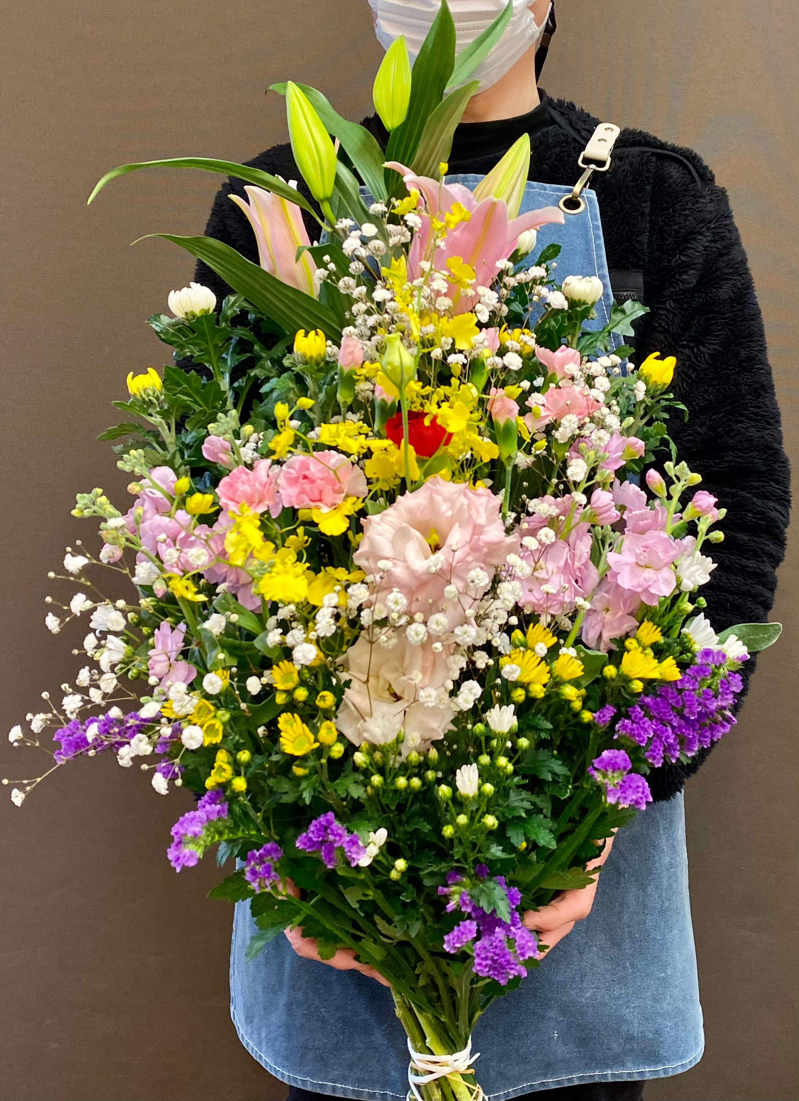 百合、トルコキキョウ、菊、カーネーション、季節の花などを入れて、見栄え良く仕上げました。